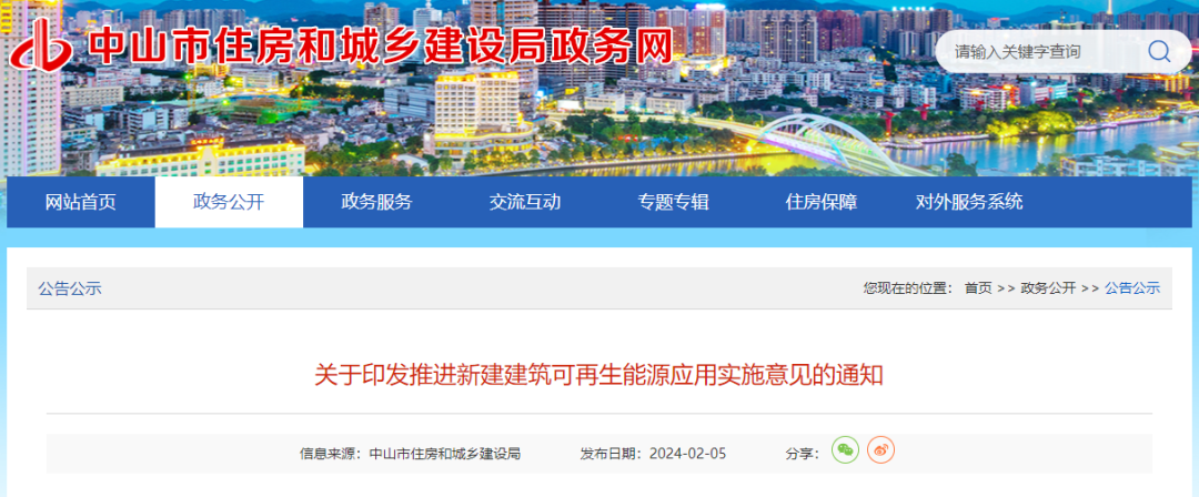 2月5日,广东省中山市住建局印发《推进新建建筑可再生能源应用实施意见》,《实施意见》明确:新建工业建筑、民用建筑应按要求使用一种或多种可再生能源。到2025年,建筑用能结构持续优化,城镇新建建筑可再生能源替代率达到8%。到2030年,城镇新建建筑可再生能源替代率达到8%以上。
